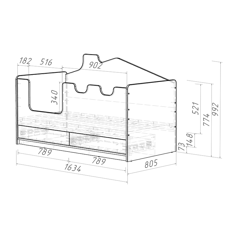 Безопасность ребенка во время сна и игр - это основное внимание при создании данной кровати. Высокие безопасные борта высотой 521 мм обеспечивают надежную защиту от падений, а отсутствие острых углов и мягкий противоударный кант увеличивают безопасность использования. Стилизованный под домик задний борт создает атмосферу игры и фантазии, стимулируя развитие детского воображения.