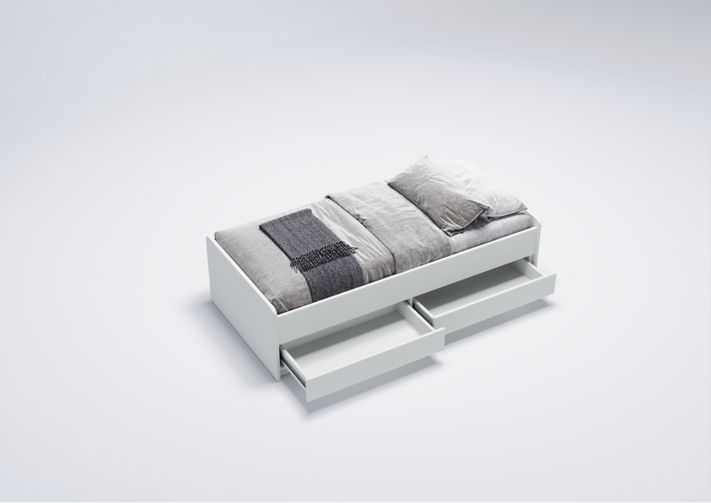 3.    Практичные ящики: Кровать оснащена двумя выдвижными вместительными ящиками, которые оборудованы телескопическими направляющими с фиксаторами для легкого открытия и закрытия. Это предоставляет дополнительное место для хранения игрушек, одежды или постельного белья, что особенно удобно в ограниченном пространстве.
