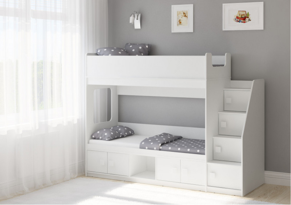 Классическая детская двухъярусная кровать с двумя параллельными спальными местами размером 1750х750 и 1900х750, закрытыми местами хранения и угловой лестницей-стеллажем.