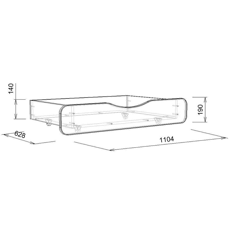 Ящик размером 1104х628х200 отлично помещается под нижний ярус,удобно выкатывается и закатывается,так как оборудован колёсиками.